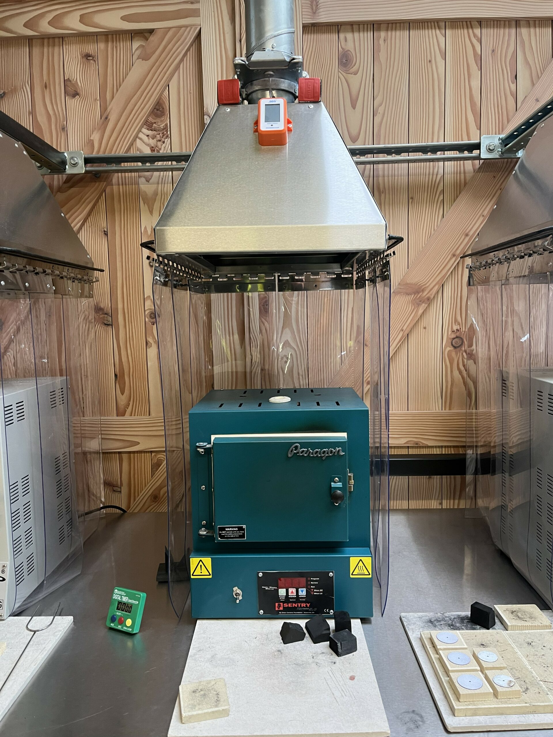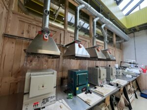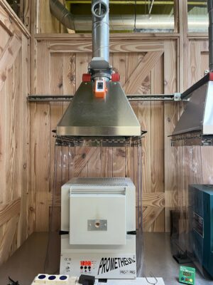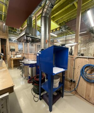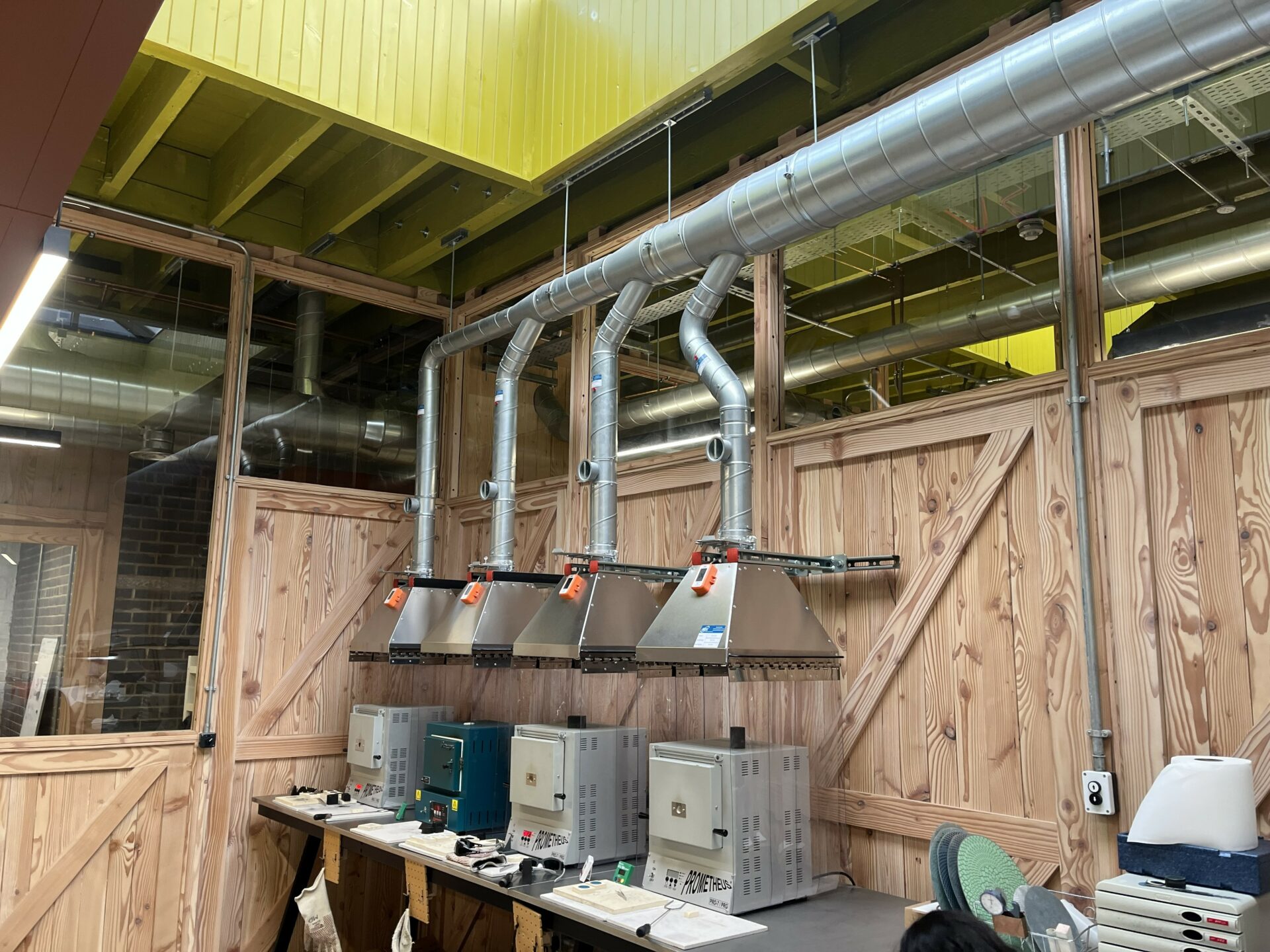 - Custom canopy hoods were fabricated to fit the dimensions of each kiln and workspace, along with a custom fabricated and powder coated brazing hood/station for hot works.