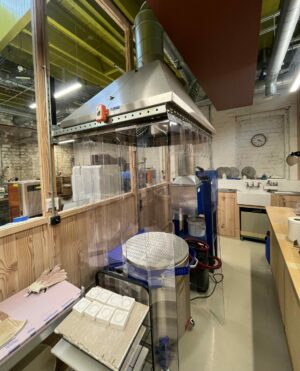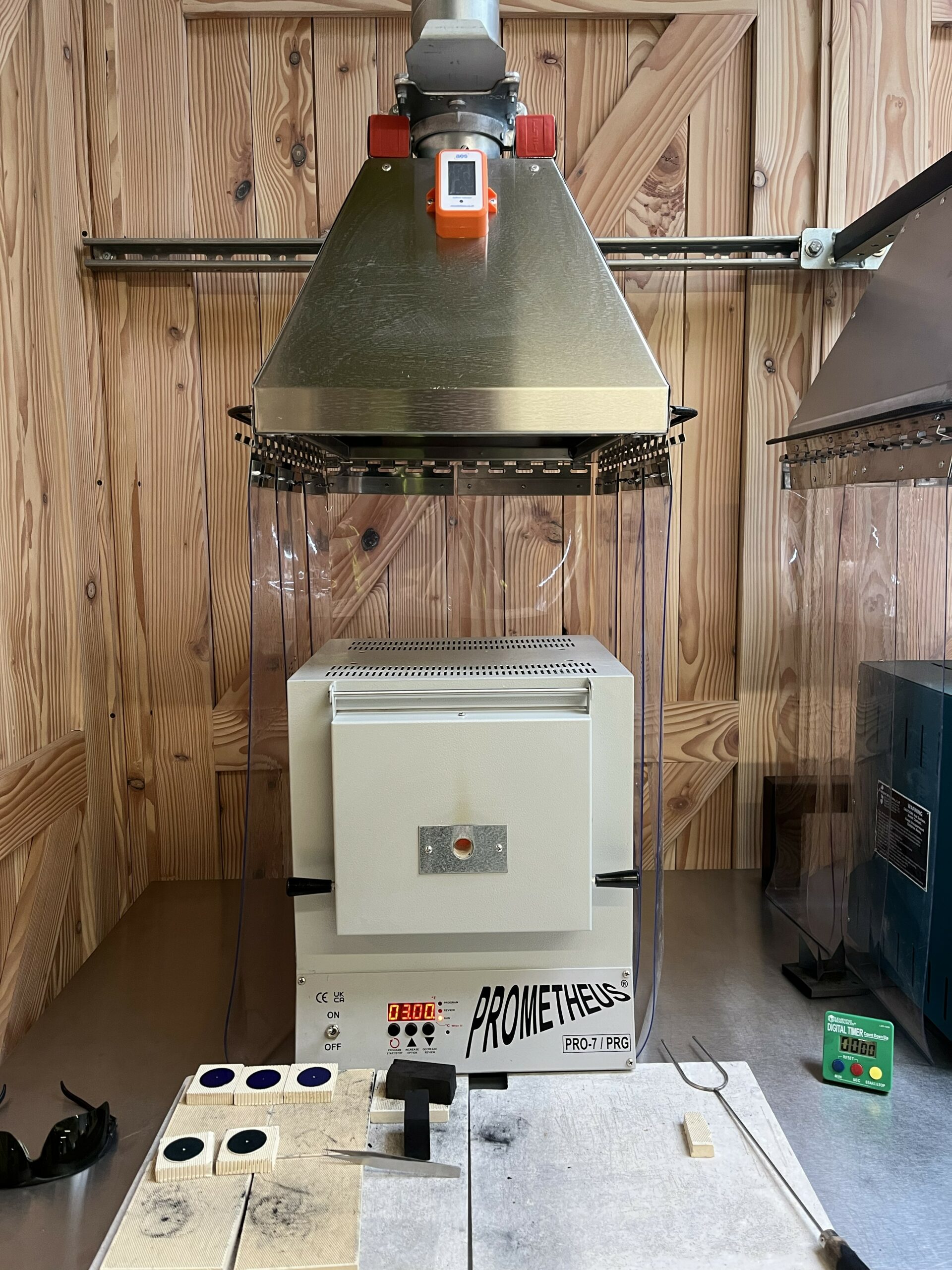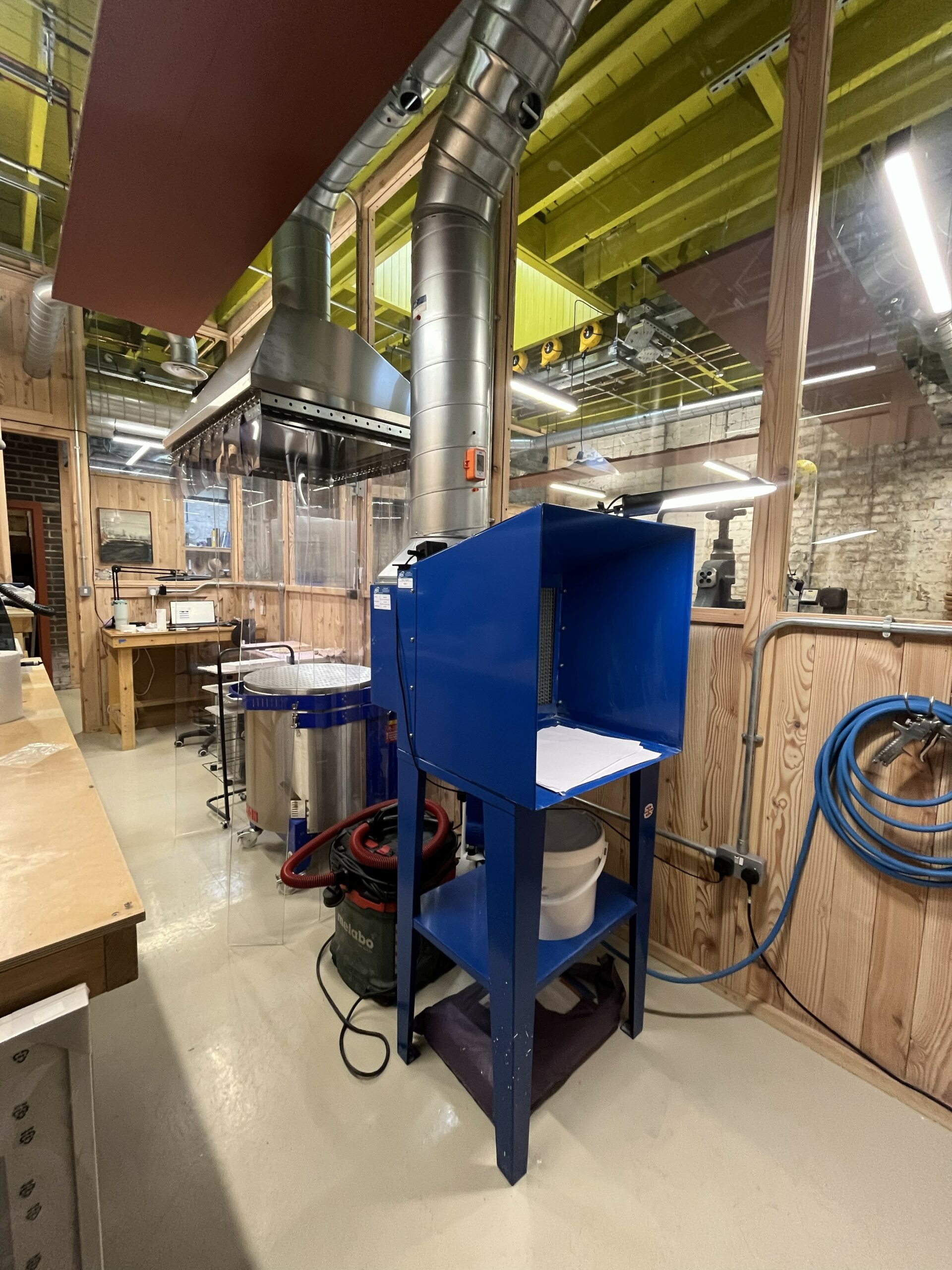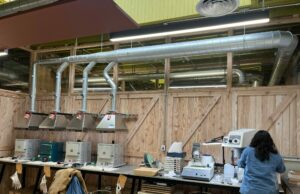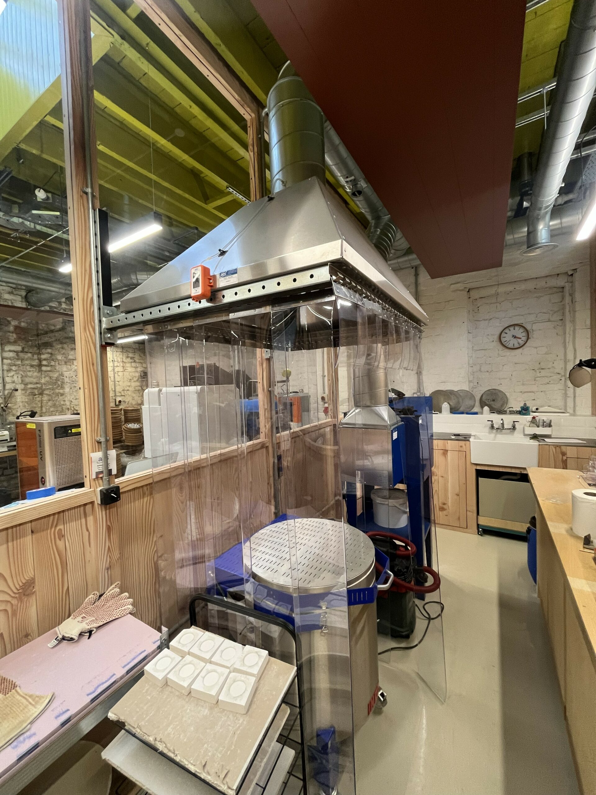 - Custom canopy hoods were fabricated to fit the dimensions of each kiln and workspace, along with a custom fabricated and powder coated brazing hood/station for hot works.